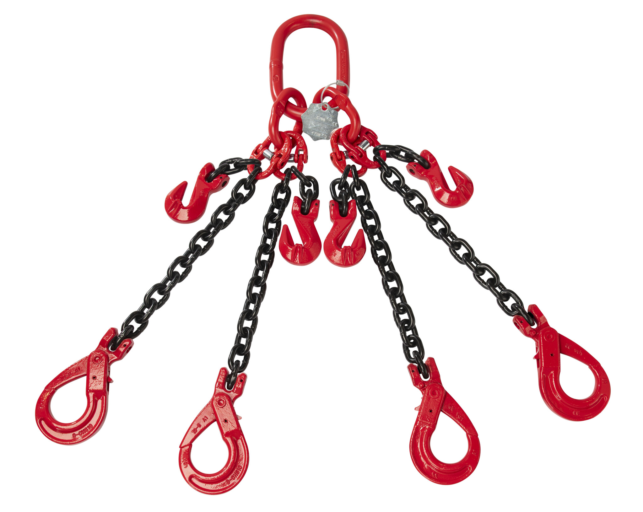 VDH-Kette 4-strängig mit Sicherheits- und Kerbhaken. Bestehend aus Oberlenker mit Kerbhaken, 4x hochwertiger Hebekette und 4x robustem Sicherheitshaken. Erhältlich in jeder Länge und Art von Hebehaken, einschließlich Zertifikat.