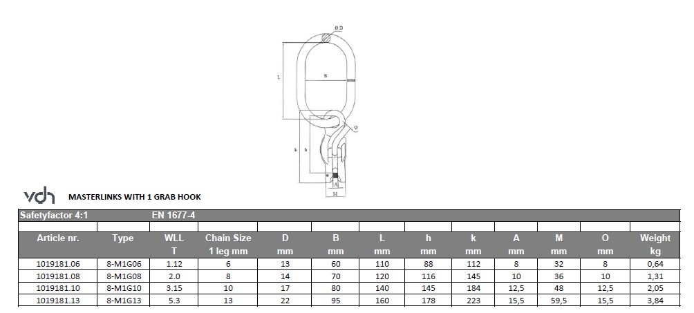 Choose the VDH Grade 80 master link assembly with integrated shortening hook (Type 8-M1G) for a robust, safe, and flexible lifting solution. Contact us for custom configurations and orders!